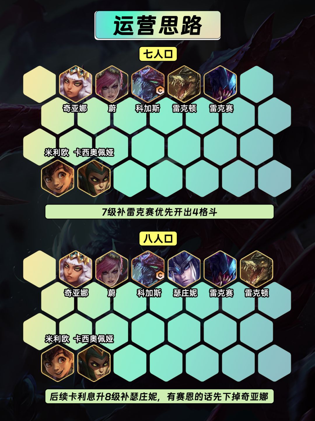 8⃣8级可以补瑟庄妮,如果有赛恩可以下掉奇亚娜优先开出6格斗