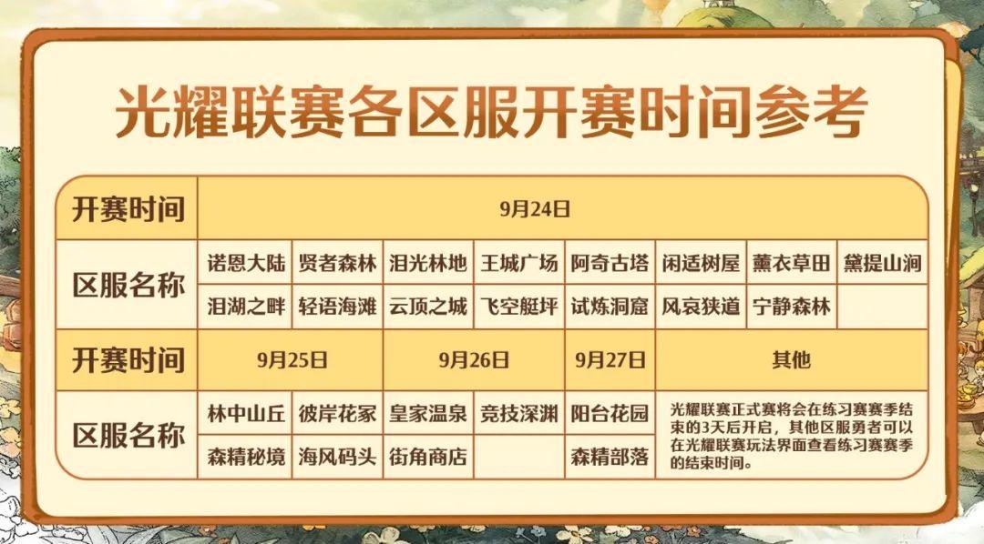 9月21日更新后,首批开服的服务器将会拉开光耀联赛正式赛的序幕,并将于9月24日正式开战,各区服对应开战时间可参考下图: