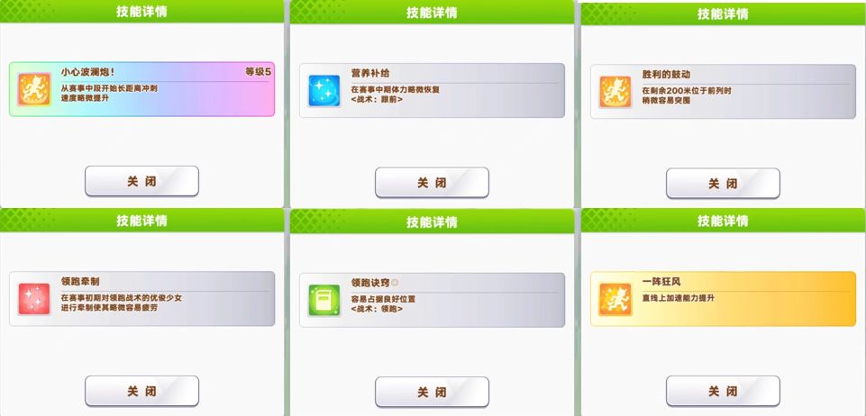 接着讲马娘的技能,技能分为五种,彩色是马娘的大招,蓝色是回复技能,黄色是给自己加buff,红色是给对手上debuff干扰对手,绿色是被动技能(满足条件时必定发动),另外有些技能是带金边的,这种可以理解为对应技能的加强版。