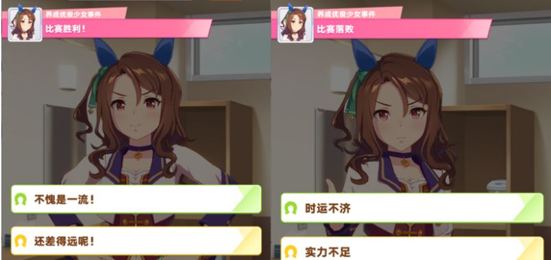参加生涯外的比赛:取得第一,选项1体力-15~20,+随机属性点/pt点,选项2体力-5~30,+随机属性点/pt点;未取得第一,选项1体力-20~25,+随机属性点/pt点,选项2体力-5~35,+随机属性点/pt点;