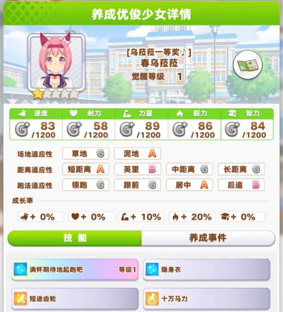 春乌菈菈强度不高,但是泥地属性的马比较少,前期卡比较少,可以简单养一养,补一下竞技场的位置。