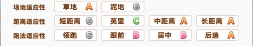 适应性的等级分别为S/A/B/C/D/E/F/G,S最高,G最低,我们要尽量选择马娘适应性高的场地、距离和跑法。