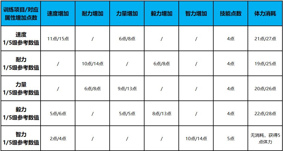 训练属性随着训练等级提升,会增加获得的属性点,如下图1级/5级获得属性点及消耗都会有变动。