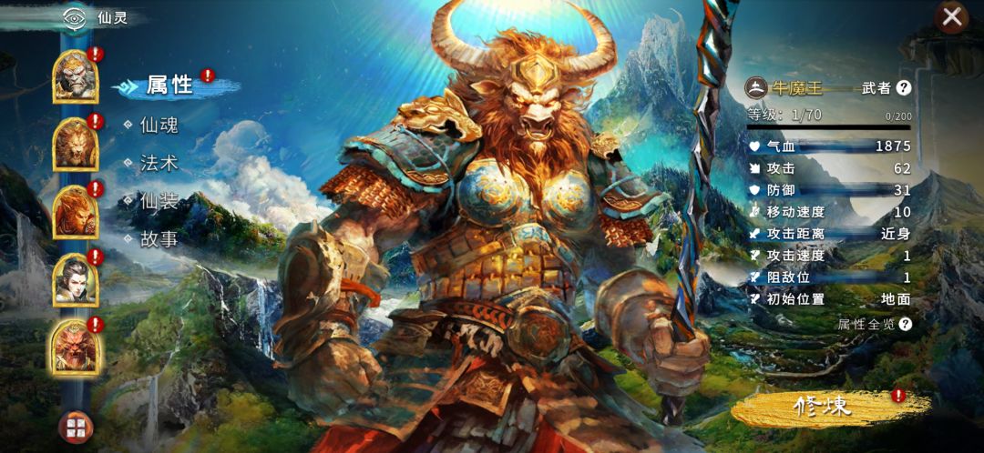 力大能拔千钧山,牛气冲天称魔王。牛魔王每次普通攻击【地煞劲气】时将给目标造成100%攻击的土属性伤害;必杀法术【铁牛冲撞】施放时,牛魔王变成魔牛冲撞敌人,对自身周围2队敌军兵团造成110%-150%攻击力的土属性法术伤害。小技能【牛魔之怒】作用于战斗开始,将直接提升自身的普通攻击伤害,加快自身灵气恢复速度;被动技能【嗜血】将在牛魔王自身气血低于50%时自动触发,给牛魔王带来高达25%的攻击力加成;【法天象地】在本场战斗牛魔王首次受到致命伤害时,将带给牛魔王10s的免死状态。牛魔王立志打遍三界不服者,被动技能【嗜血】和【法天象地】都体现了对敌人不死不休,战至身死的决心。