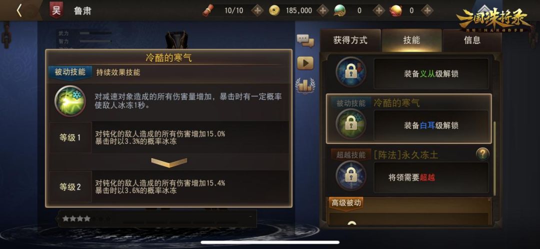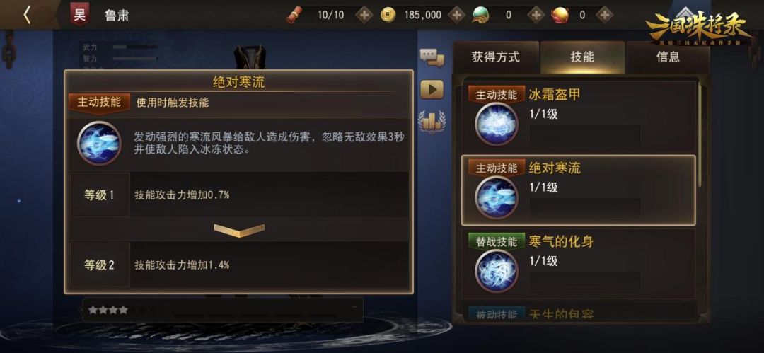 鲁肃的替战技能【寒气的化身】,控制力超强。这个技能让鲁肃能够以寒冷的力量对敌人进行广域攻击。当他释放这个技能时,寒流将笼罩周围的敌人,使他们被冰冷的气息所凝固。冰冻状态持续1.5秒,让敌人无法进行行动和反击,为您的队伍创造了有利的战斗机会。