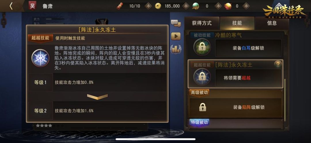 而鲁肃的超越技能【[阵法]永久冻土】属于控制型技能,鲁肃渐渐冰冻自己周围的土地并设置掉落无数冰块的阵地。阵地完成的瞬间,阵内的敌人会变慢且在3秒内使其陷入冰冻状态。冰块对敌人造成可穿透无敌的伤害,并在3秒内使其陷入冰冻状态。离开阵地后,减速效果将消失。