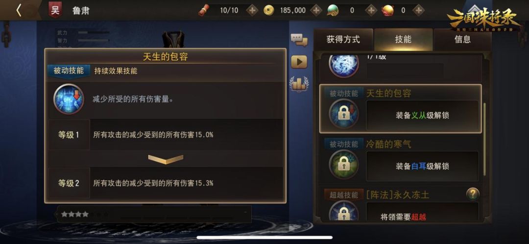 鲁肃有两大被动技能——【冷酷的寒气】【天生的包容】。鲁肃在使用【冷酷的寒气】时,可对减速对象造成的所有伤害量增加,鲁肃暴击时有一定概率使敌人冰冻1秒。这意味着他能够有效地消耗敌人的生命值,并且在暴击时还有机会使敌人陷入冰冻状态,使其在短时间内无法行动,为您的队伍争取更多的优势。【天生的包容】则可减少鲁肃所受的所有伤害量,这使他在面对敌人的攻击时更加坚韧,能够更好地保护自己,并延长他在战场上的生存能力。