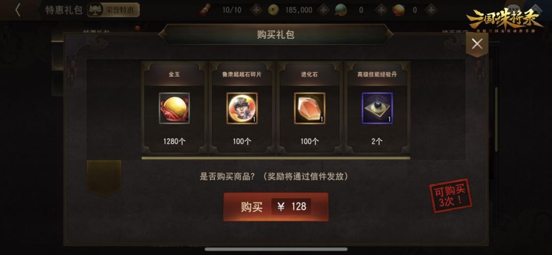 而在鲁肃超越礼包中,有金玉*1280,鲁肃超越石碎片*100,进化石*100,高级技能经验丹*2,超多养成资源助力主公一展宏图!