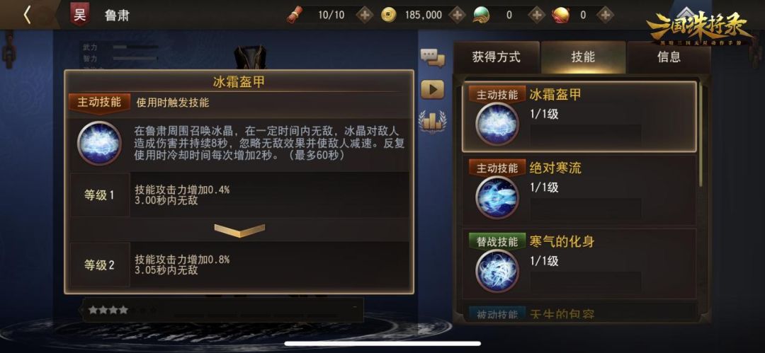 作为一名五星稀有金色武将,鲁肃凭借其控制、减速和输出的能力,成为战场上不可多得的控制型辅助。鲁肃可使用主动技能【冰霜盔甲】,在其周围召唤冰晶,在一定时间内无敌,冰晶对敌人造成伤害并持续8秒,忽略无敌效果并使敌人减速。反复使用时冷却时间每次增加2秒(最多60秒)。