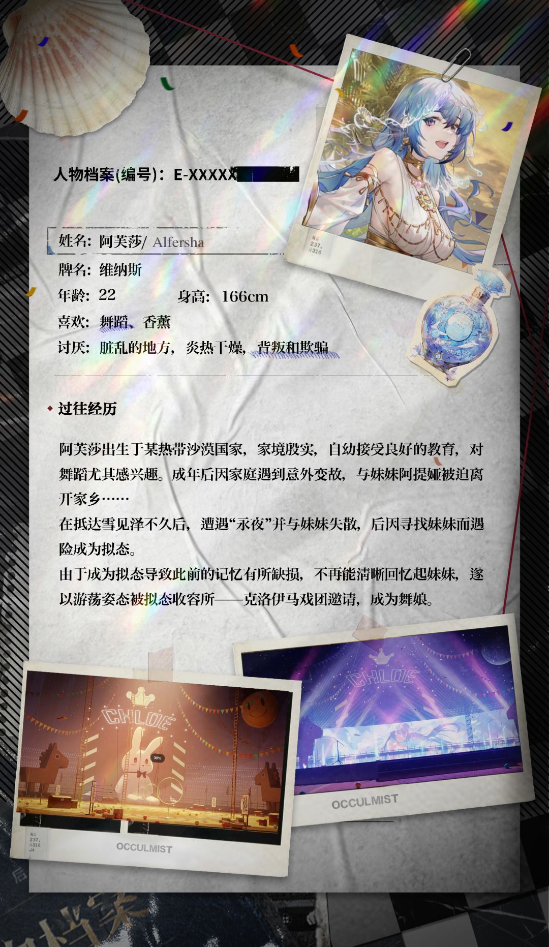 阿芙莎出生于某热带沙漠国家,家境殷实,自幼接受良好的教育,对舞蹈尤其感兴趣。成年后因家庭遇到意外变故,与妹妹阿提娅被迫离开家乡……在抵达雪见泽不久后,遭遇“永夜”并与妹妹失散,后因寻找妹妹而遇险成为拟态。