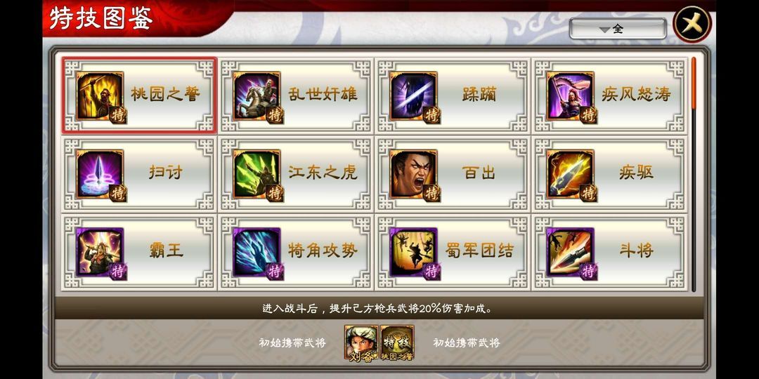 在“特技传授”和“特技升级”界面都会有【特技图鉴】按钮,可以供主公查看所有特技以及特技对应的武将,方便主公们快速培养武将特技。