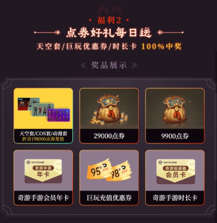 奖池奖励包含天空套装、高额点券、时长卡、优惠券等 100%中奖噢!