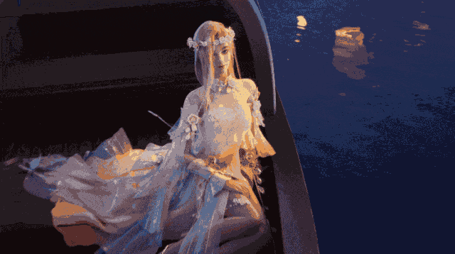 而身后穿【东君信】的她盈盈望来,莹莹闪光的轻纱裙摆在夜色中更显仙气飘飘,洁白的花环衬着秀美的面庞,更添几分纯洁。温柔恬静有如清风,仿佛世间万物都不及她低眼拂过鬓发的微笑。