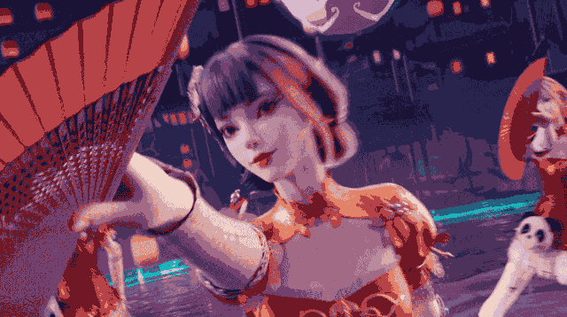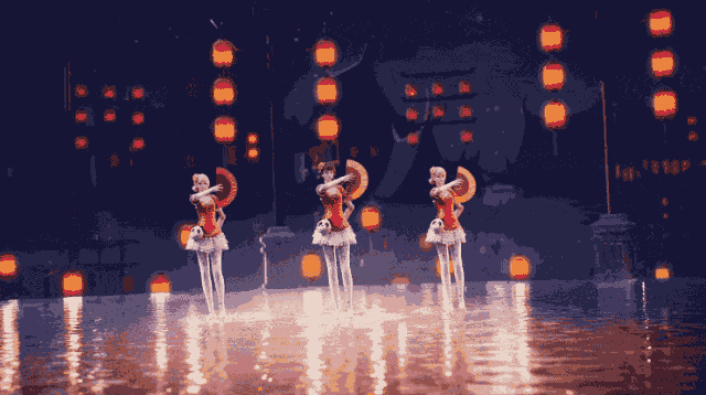 折扇轻移,长睫微动,头戴簪花,眸含星辰,三位女团成员身着高人气时装【红舞】一齐亮相!手中的折扇随心而动,收放自如;手势缤纷,柔曼的手臂婀娜生姿;屈膝倾身,腰肢袅娜轻盈;裙裾飘飞,转身间在空中划出流畅的弧线。夏日清凉水舞台和国潮风格的搭配,让人眼前一亮。