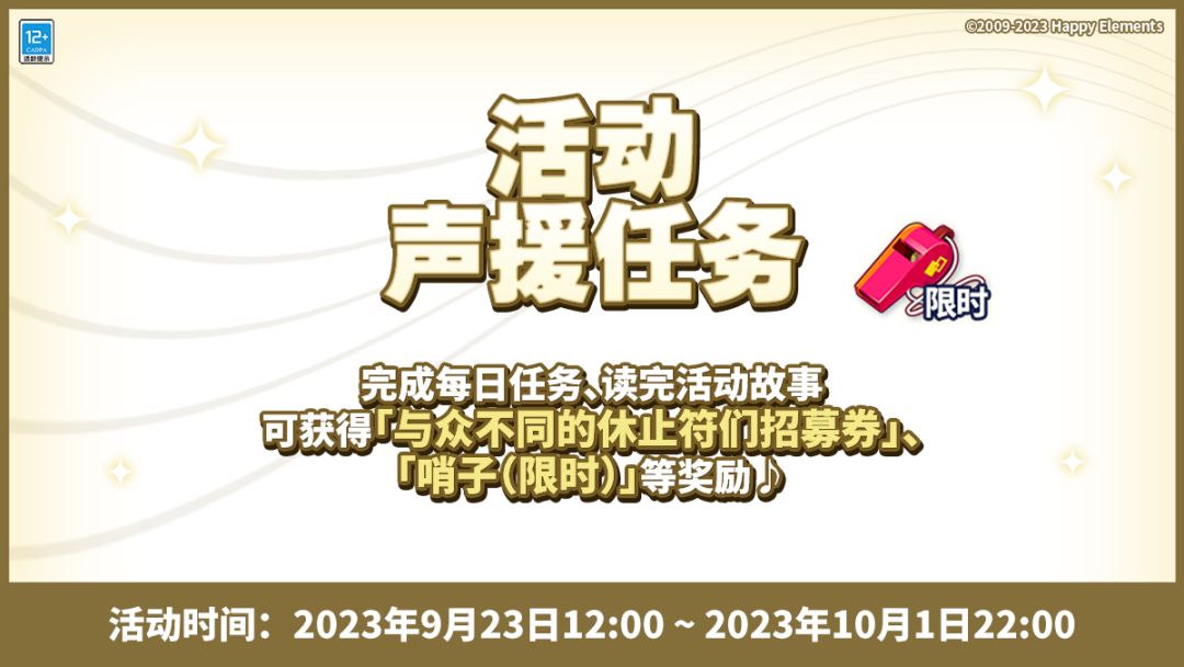 每日任务:活动期间,每日0点游戏内将刷新声援任务;完成声援任务即可获得哨子(限时)、「与众不同的休止符们招募券」等奖励!
