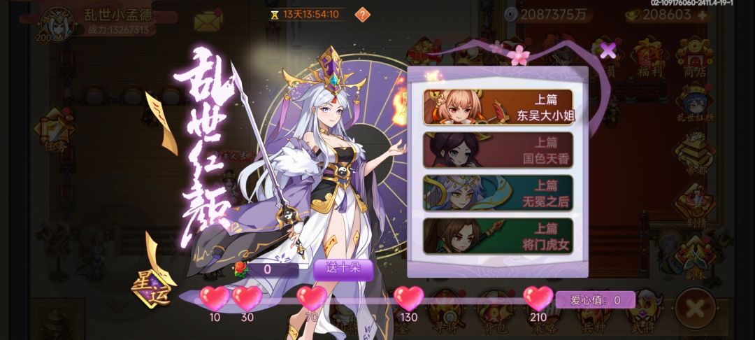活动内容:活动期间,完成乱世红颜剧情副本挑战收集玫瑰花,赠送玫瑰花获取爱心值领取奖励。(活动结束时未使用的道具“玫瑰花”将会被过期清除)
