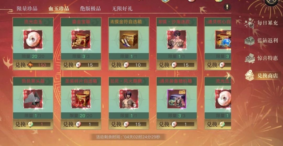活动商店限时开启!奇物【辟邪赤玺】上线!活动兑币更能兑换核心命纹自选箱、载具核心自选箱、圣装碎片自选箱、兵器谱、聚灵石、幻命天珠等等珍稀道具,更多道具,快来选购吧~