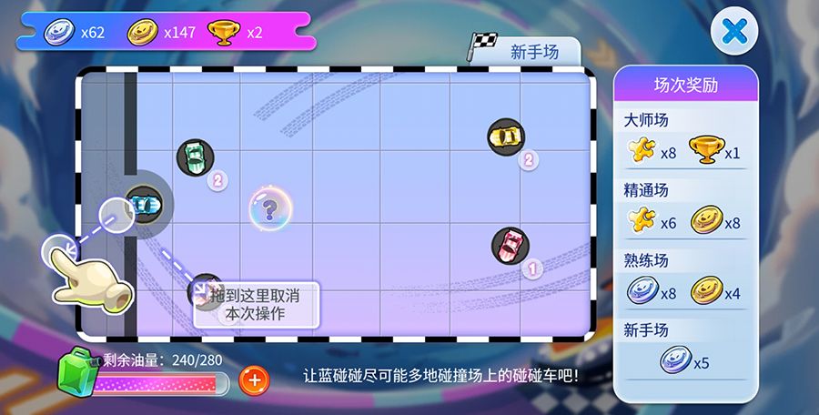 当场上碰碰车全部消失则通过本场次并获得奖励,小车消失或遇到问号气泡都会有奖励可以获得,努力收集更多奖杯吧!