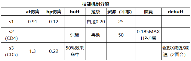 S2是最容易被忽视的技能,不仅可以给队友提供巨量护盾(大部分情况比迪埃妮的盾都厚),同时S2拥有最重要的“再动”机制及提供50斗志的效果,使技能回转大力加快。“再动”可以使全部技能冷却减少2回合,意味着S2实际只有2回合真空期;而S2+S1能瞬间提供75斗志,若已有斗志,则能瞬间打出S1+S3的小爆发。