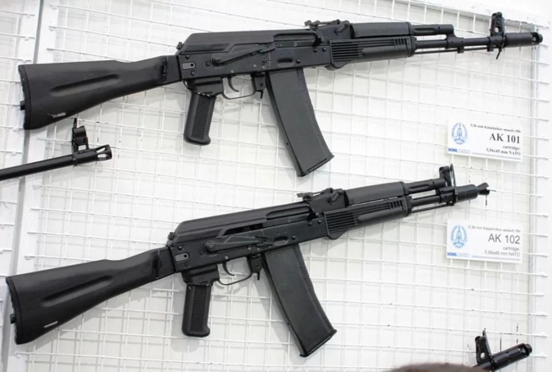 时间来到20世纪90年代,伊热夫斯克机器制造厂(卡拉什尼科夫集团的前身之一)推出了AK100系列用于出口创收(要恰饭的嘛),第一款作品便是基于AK74M研发的AK101。由于是为了赚取外汇而诞生的武器,所以AK101改为了使用NATO 5.56x45毫米弹药。其后推出的AK102基本与之相同,不过是使用更短枪管的缩短版本,定位是介乎于全尺寸型步枪和更紧凑的AKS74U之间的中间型号。