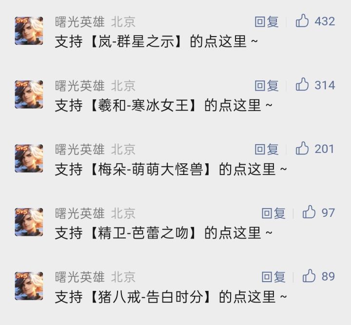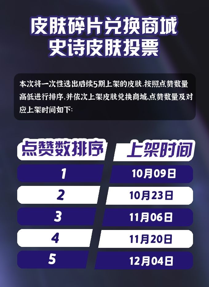 本次将一次性选出后续5期上架的皮肤,按照点赞数量高低进行排序,并依次上架皮肤兑换商城。