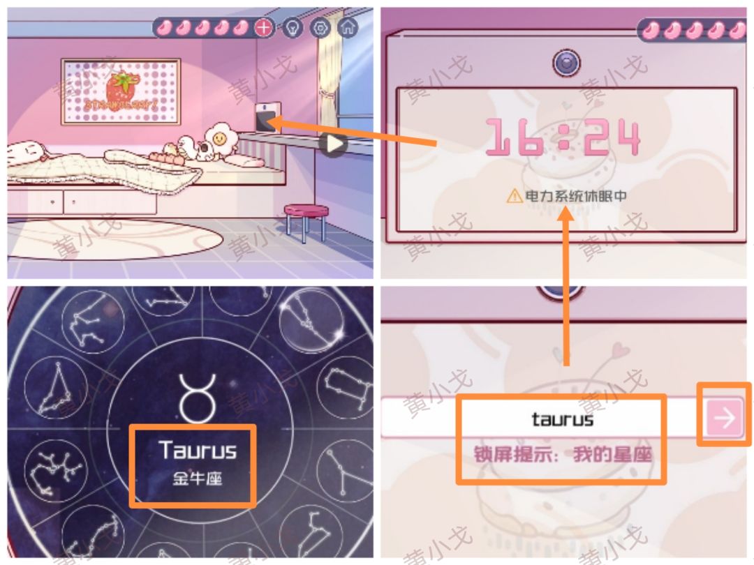 6.(筱圆房间-房间)点击床头的电力系统控制面板,根据上面的提示(我的星座),输入密码:Tauruus