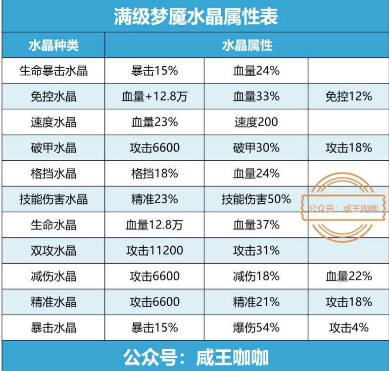 先给大家看一份咖咖统计的满级梦魇水晶数据表,让大家一眼看去就清楚所有的满级梦魇水晶。