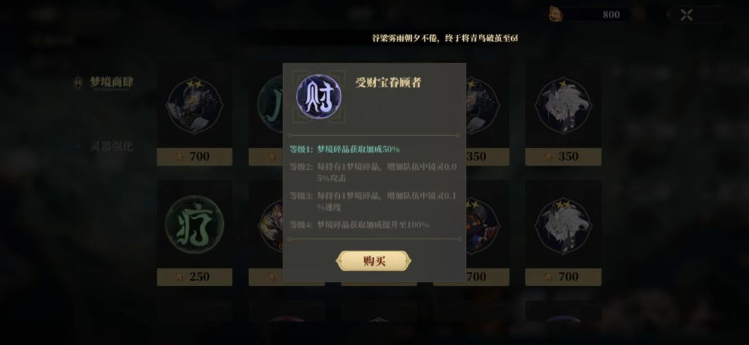 第一、二层选择加成>资源>灵器,第三层无脑灵器其次资源。加成无脑选择受财宝眷顾者,拉满5级配合天狗必过。其次是此身比肩神明(天狗、九尾狐、后羿都是凡族)、斩灭有就拿,凑齐愚、缓、晚不用升级。开局有财宝的情况下资源>加成>灵器。所有奇术都不要拿,直接放弃拿资源。