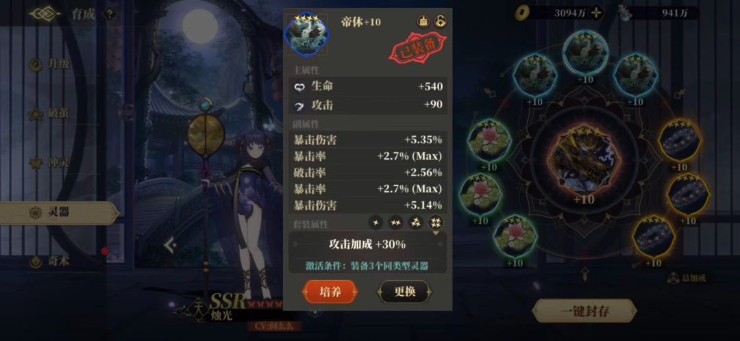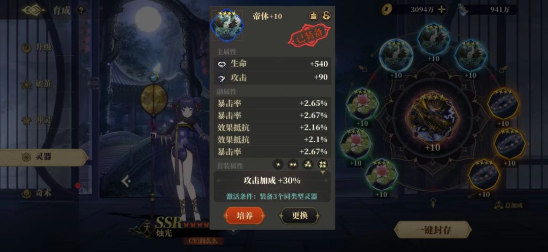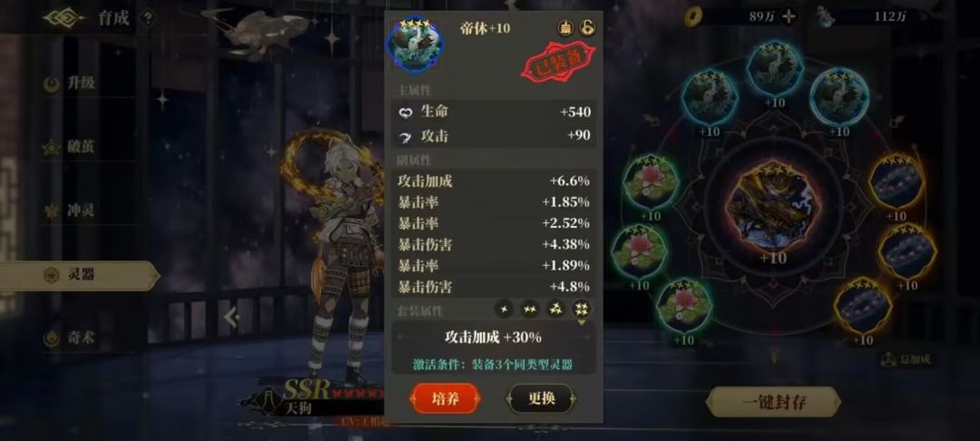2、白泽效果命中能堆多高堆多高,地跟人不用管套装效果只要效果命中,和带嗷鸣避免断火。一句话就是多强化灵器,没用的丢给神芝跟乘黄还有菟丝子。