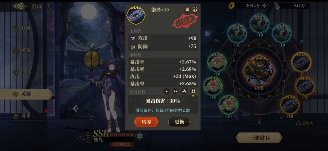 主c灵器优先第一条词条暴击率或者暴击伤害去强化+10出三暴(3暴击伤害、2暴击率1暴击伤害等等),不要攻击加成或破击率去强化+10,因为你别说三暴能不能两暴击率都只有30%的概率,最好的结果也就是四攻击类词条。拉满暴都难,本来就放弃暴击伤害了,连满暴都做不到的话岂不是捡了芝麻丢了西瓜,性价比太低了。这可是我强化了十六万体力出来的经验,破击强度100层爬塔以上才有用,其次就是pvp单体打夔牛重明这种堆格挡率的才有用。