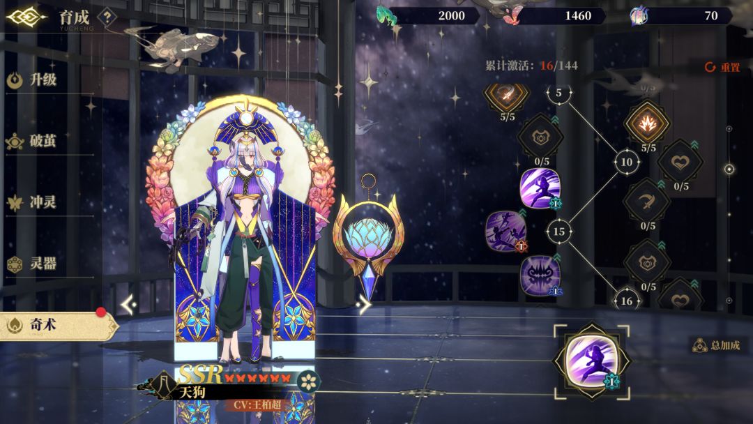 再说六人口怎么选择,sr白泽、神芝、乘黄可以养到70,r级的鹣鹣、这是可以直接无脑练到60的。既有减伤又免能量。在你没有ssr夫诸、愚强前,这两个是最好使的T跟控制。尤其是爬塔打反伤狗,没有鹣鹣根本保不住奶妈跟共工。天狗反到成了打工仔。第六个选择就比较多了,我个人推荐乘皇,根据版本更新,常羲砍的程度。后期爬塔只能带单c,三控的情况下,乘黄的控制涟最稳,满蝶的情况下。