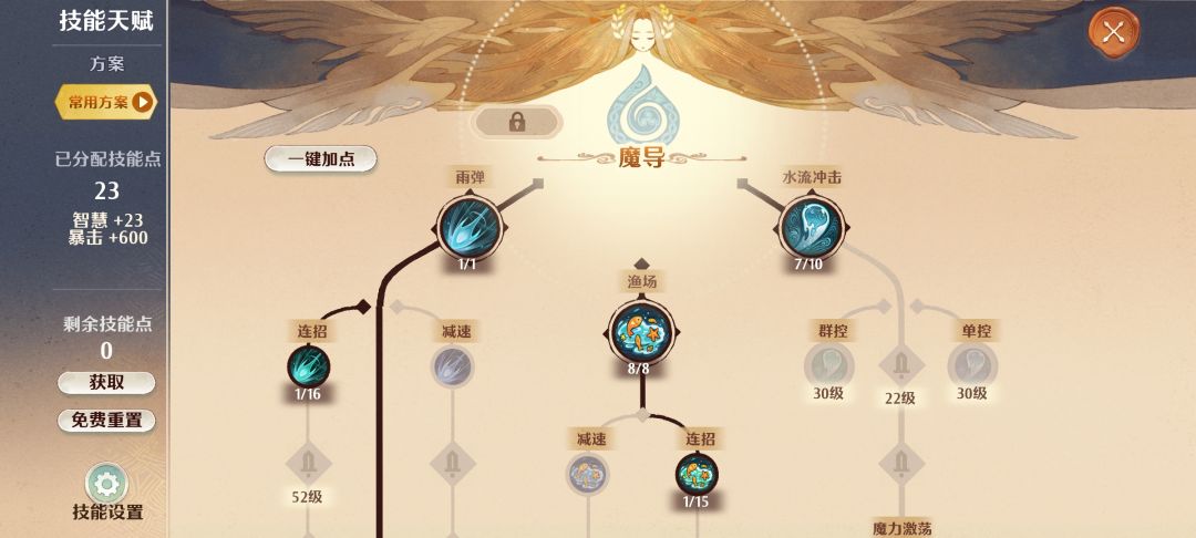 技能则是技能树展示,角色提升一级,则免费提供一个技能点,后期服务器锁级,多余的经验也会转变为技能点,什么?看不懂?不会点?不要急,官方贴心提供一键加点。(点赞)