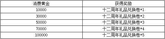 【活动内容】:活动期间内,只要当日在游戏内消费黄金达到指定额度,即可领取【十二周年礼品兑换卷】。