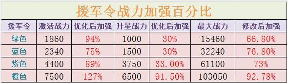 援军初始基础属性、成长属性、星级属性得到了较大的加强,玩家激活与升星援军获得的属性与战力大幅提升。这无疑让玩家打造援军令的热情高涨,首先激活各种援军图鉴,就能迅速提升一波属性和战力,即时提升效果显著,普通玩家紫色和橙色援军的养成耗时持久,但是快速收集绿色和蓝色援军要容易很多,因此普通玩家援军令养成初期还是建议以开援军图鉴和针对性养成为主。其次我们在给援军天赋、特训子技能提高等级时战力加倍,类似培养不仅可以增强援军的普攻、技能伤害,还能反哺玩家主将的同时带来大量战力增长,培养的综合性价比突出。