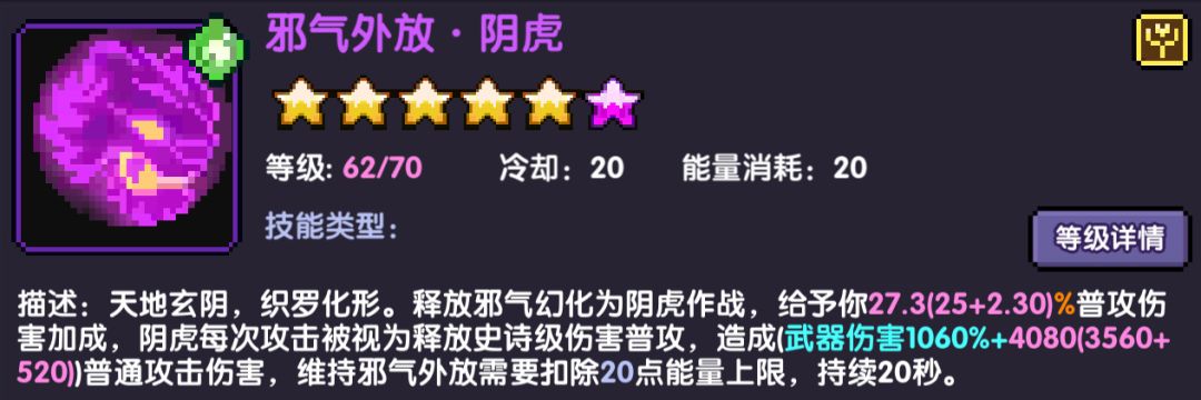 虎伤=(武器伤害×1060%+3560+额外技能等级×260)×3×150%×普伤