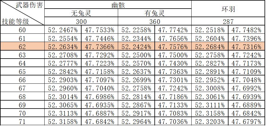 粗略计算的话可考虑忽略武器伤害和技能等级,直接近似取技混系数为52.25%,普混系数为47.75%