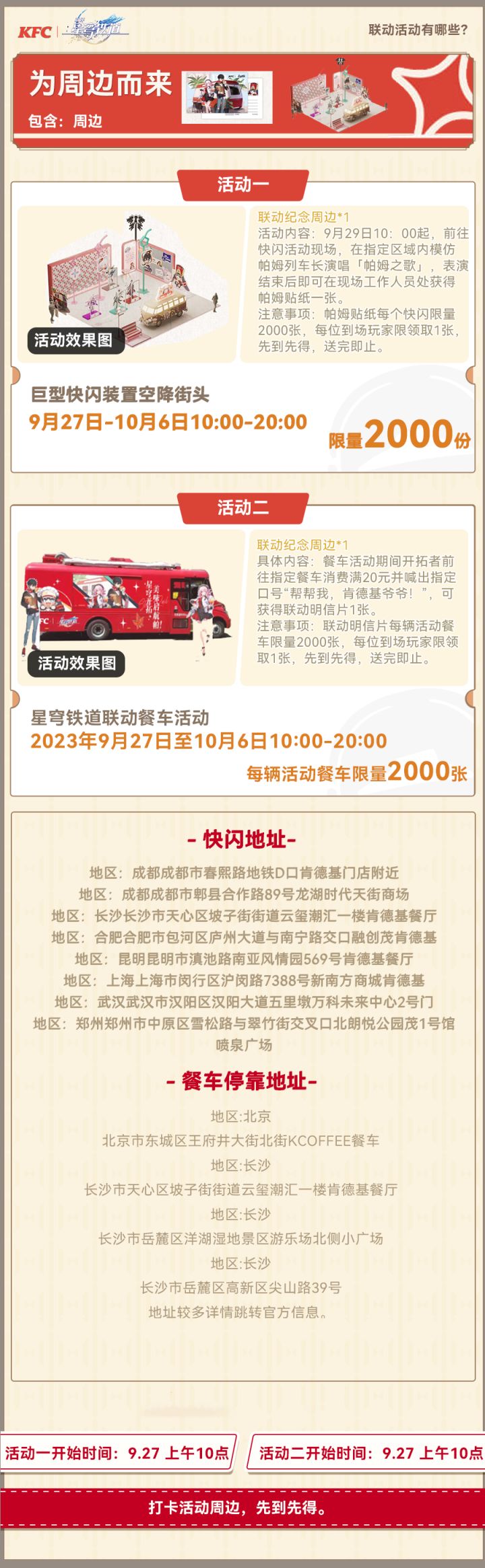 9月27日——10月6日,10点-22点,到指定餐车买满20r喊口号送联动明信片;
