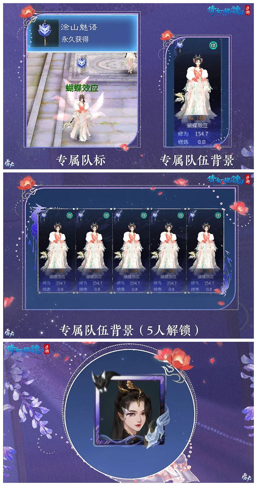 此外,换上【涂山魅语】整套时装的玩家,还将获赠全新升级的小队装饰,除了专属队标,5人还能解锁专属队伍背景,更能获得唯一永久头像框。