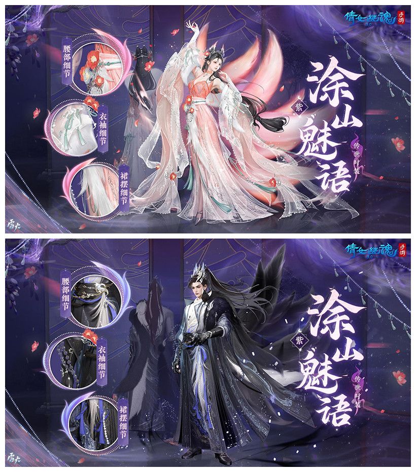 【涂山魅语】女款时装以一袭粉色长裙搭配白色轻纱刺绣披帛,超脱凡尘的气息扑面而来,腰间又别着点点鲜花,平添几分艳丽动人。男款则以黑、蓝、白三色为主色调,搭配高冠束发造型,儒雅中透着几分英气。作为首款祥瑞系列传世时装,【涂山魅语】可在【青丘宝鉴】活动中获得。10月11日活动结束后,【涂山魅语】将永不返场。