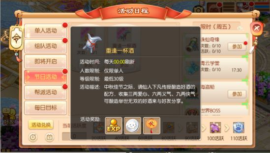 活动期间,等级满30的少侠可以单人参加这项活动,任务将于每天00:00刷新,记得寻找谪仙学习配方,收集三两爱心、六两义气、九两侠气酿造一壶举世无双的好酒,与好友分享哦!