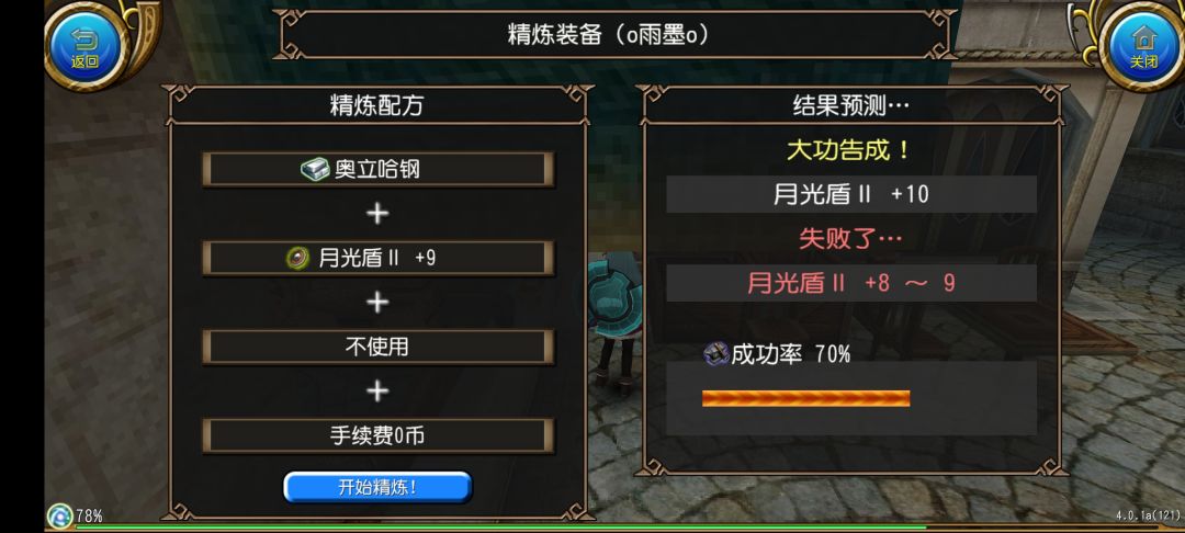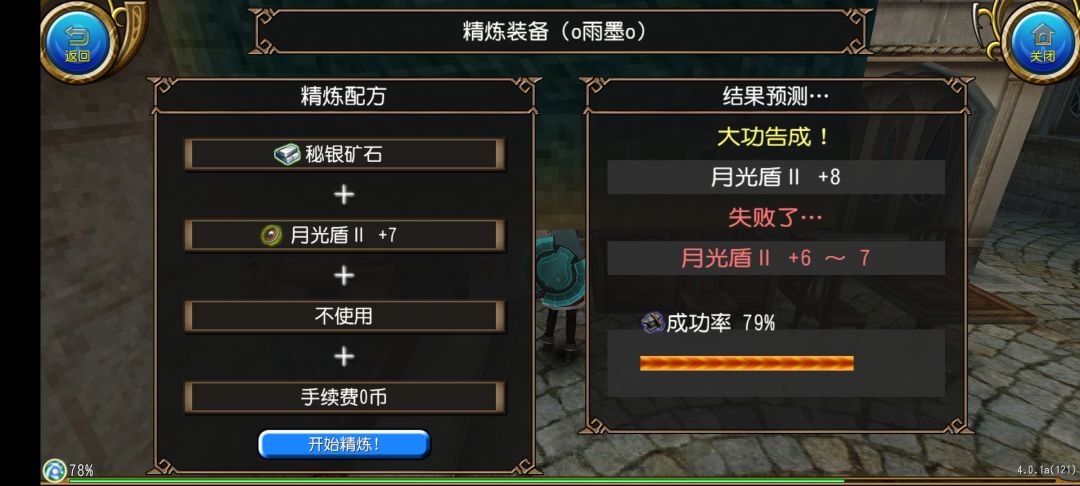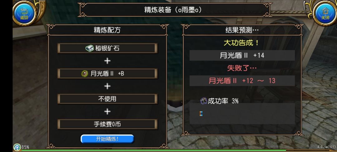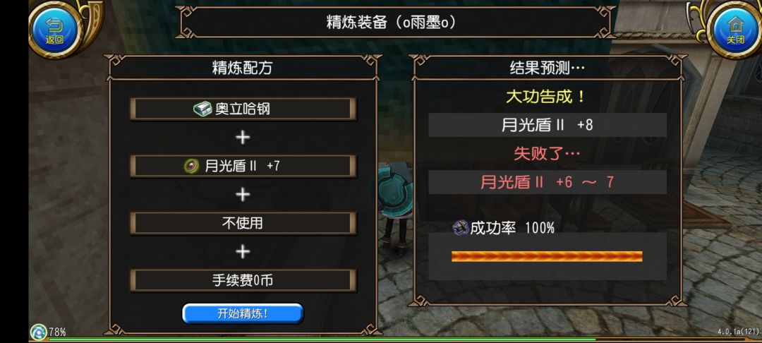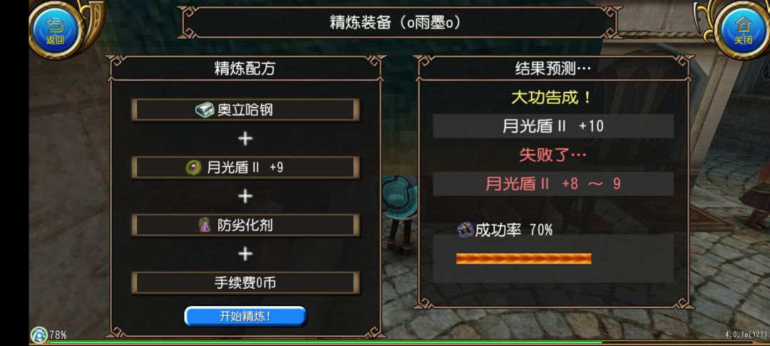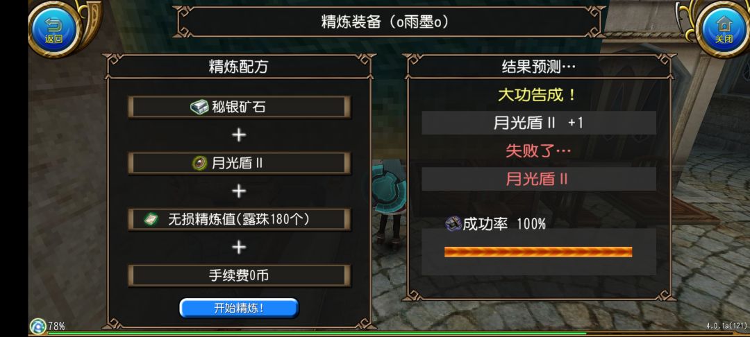 然后我们点击开始精炼!就可以开始精炼了,在动画结束之后我们就获得了月光盾II +1
