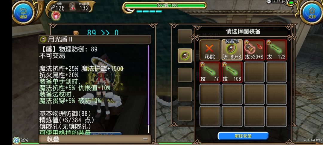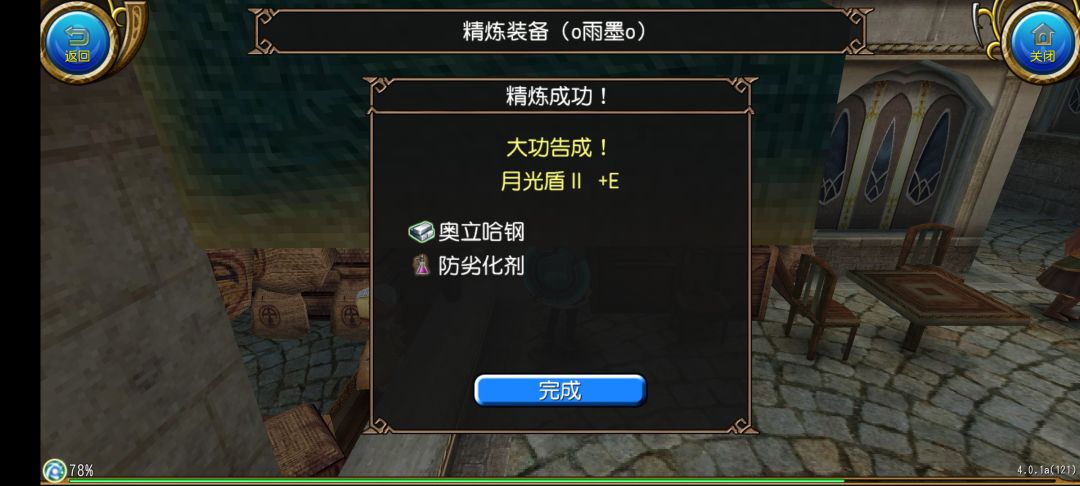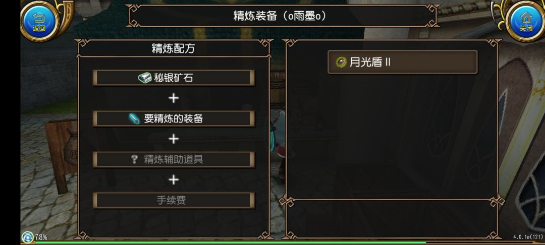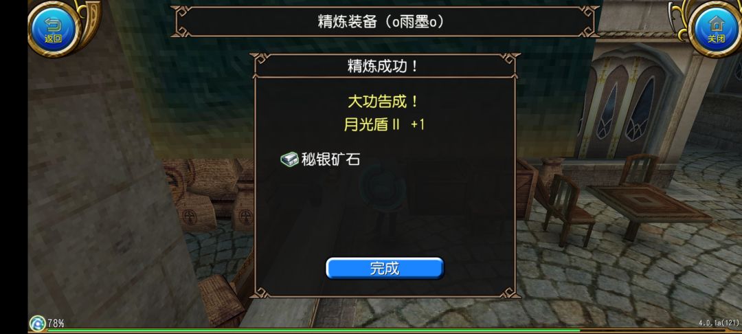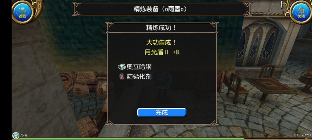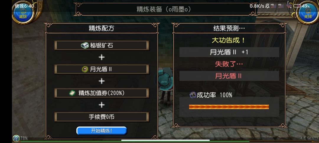 然后我们点击开始精炼!就可以开始精炼了,在动画结束之后我们就获得了月光盾II +1