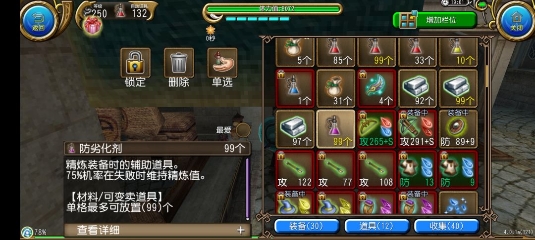 我们要使用的是防劣化剂,这也是我们之后会主要接触到的一个精炼辅助道具,他的效果是可以在精炼失败的时候有75%的几率使精炼值保持不变,相应的,防劣化剂也有很多种,我们主要用到的就是最基础的这种(直接在市场买就行了),我们接着回到精炼装备的菜单选择防劣化剂,