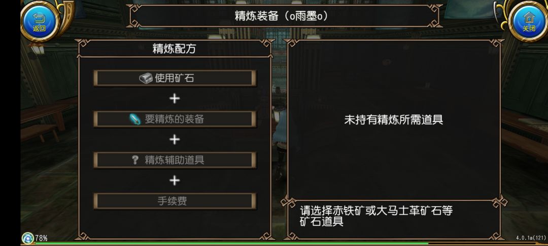 系统提示我们未持有精炼所需的道具,这个原因是因为我们身上没有携带任何的矿石道具,在精炼中我们所需要的道具总共有三种,分别是矿石,需要精炼的装备,以及精炼辅助道具,我们先来谈谈矿石