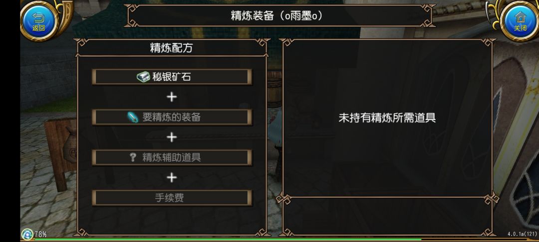 然后我们会发现系统提示我们未持有精炼所需道具,这是怎么回事呢,这时候我们打开角色的装备栏,发现装备栏没有装备任何装备
