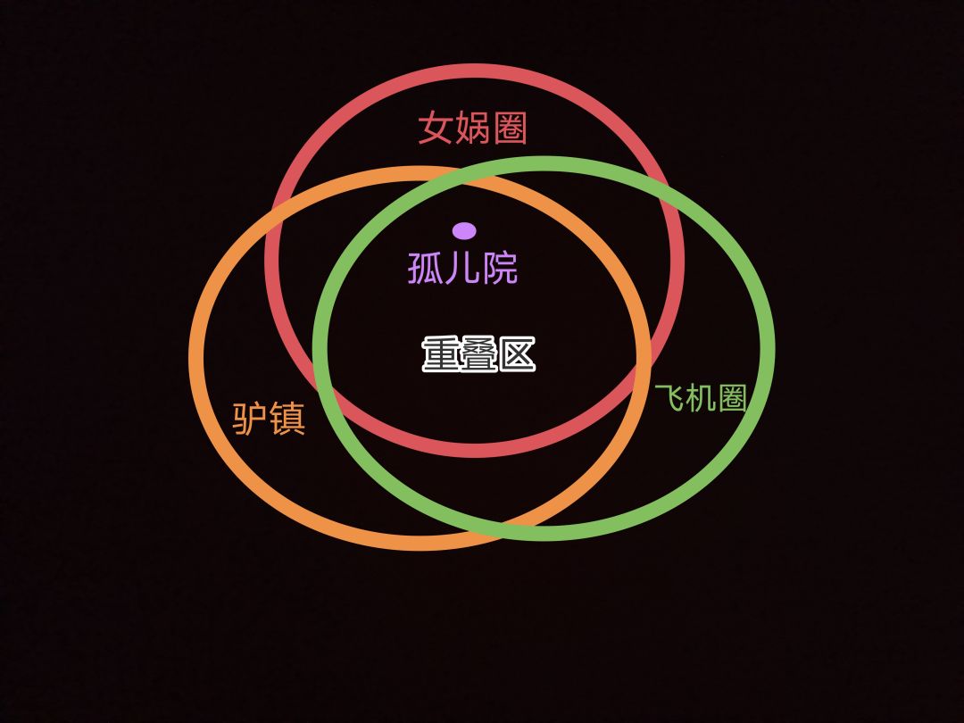 女娲圈、驴镇、飞机圈、孤儿院、重叠区大概样式