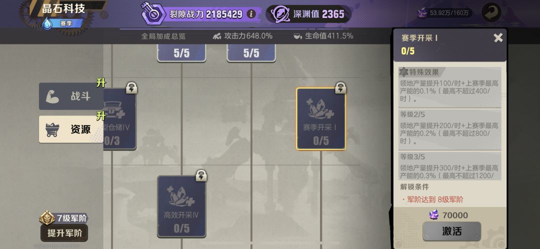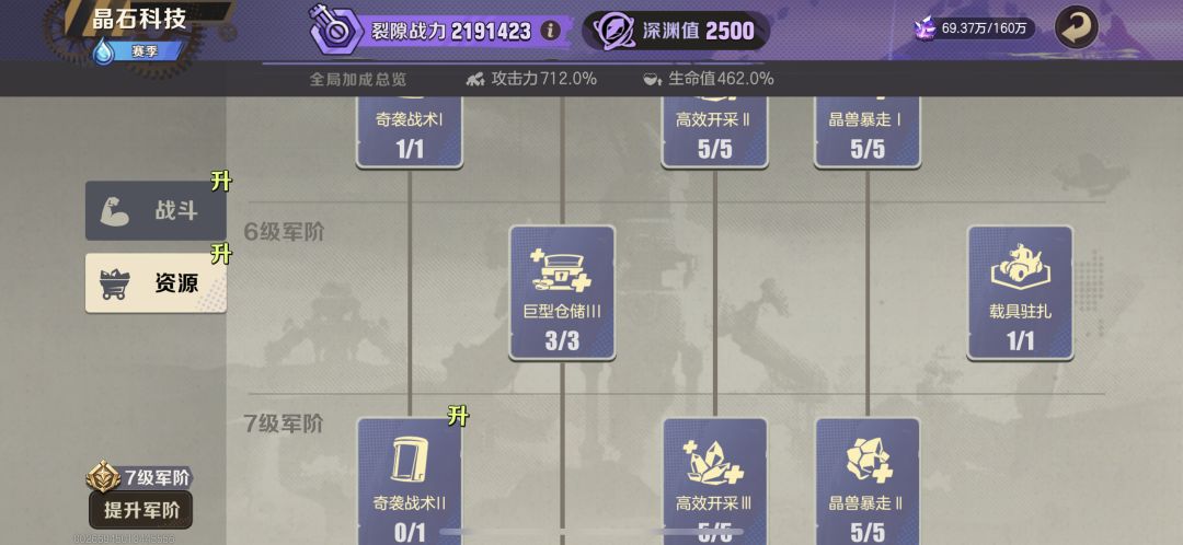第五、预留一定的晶石(100w左右),升级到八级军阶后先升满经济科技“赛季开采“,上个赛季最终产能在40w以上即可拿满科技特效,大幅增加个人产能。