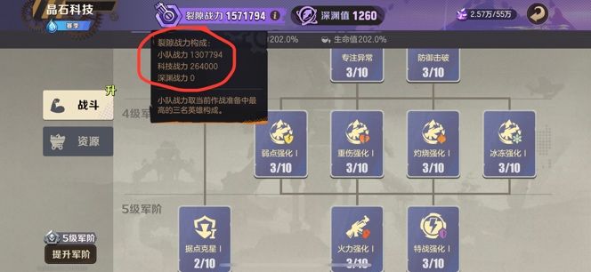 如若超过相应的科技总战力要求很多,则会大幅度降低裂隙战力门槛,例如攻坚5级矿时期,只需点开全深渊狂潮特效,由于大幅增加了深渊战力,所以小伙们100w裂隙战力就能拿下5级矿。现阶段,6级矿要求的科技总战力较高,小伙伴在触及科技总战力线提示险象环生后,就可以奋力一搏啦。