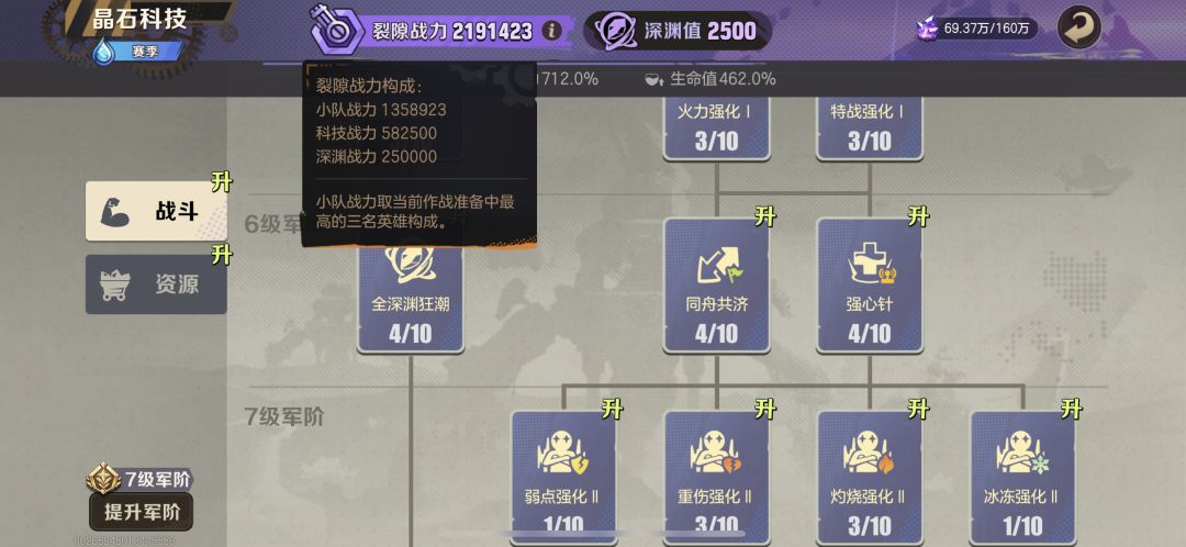 随着军阶等级的提高,晶石科技里的战斗技能可以提升更多的裂隙战力,特别是达到3级时,能够开启该技能的特效,极大地增加输出或生存能力,接下来咱们上结论: