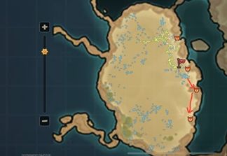 一开始小伙伴们随机分布在映波沙滩的岛屿上,按进发路线采用成群结队式向据点boss方向一同前进,行至潮汐雨林遇见第一个区域首领boss。在这里做了一个路线示意图,粉色箭头为西南岛屿主力部队,蓝色箭头为东北岛屿主力部队,在扬尘海角会师后使用白色箭头标注主力部队。